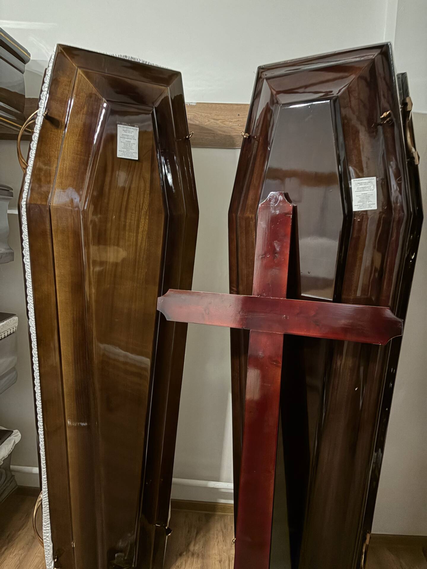 Crucea inscripționată este adesea parte din setul complet care include și sicriul funerar, ales în funcție de tipul ceremoniei.